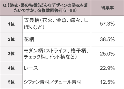 着たい浴衣の色については「白系」や「紺系」といったカラーが人気を集め、着たい浴衣のデザインは「古典柄」が過半数を超える一方、浴衣を着るときにこだわりたいポイントについては、浴衣そのものよりも小物に関するコメントが多く見られ、レースやシフォンのアイテムを上手く取り入れながらトレンドを意識した着こなしをしたいという意見が多く見られた。