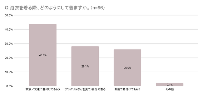 浴衣の着用方法については、「家族/友達に着付けてもらう」の43.8%に次いで「(YouTubeなどを見て)自分で着る」が28.1%と、全体の3割を占める結果となった。