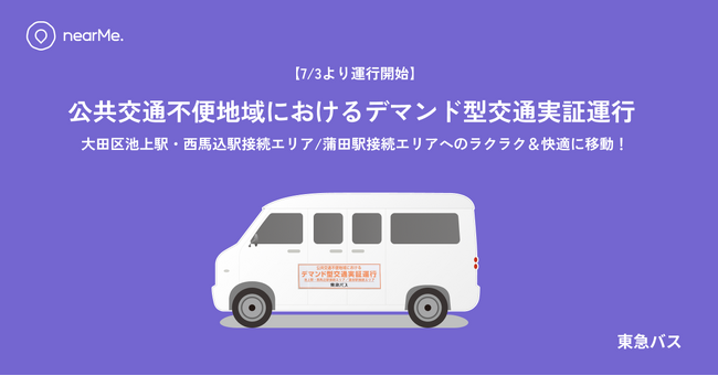 株式会社NearMe(本社:東京都中央区、代表取締役社長:高原幸一郎、以下:ニアミー)は、東京都大田区(以下、大田区)における公共交通不便地域の改善に向けて、また、新たな交通手段の検討に資するデータを取得するため、同区と取り組まれている東急バス株式会社(本社:東京都目黒区、代表取締役社長:古川卓、以下:東急バス)と連携し、「池上駅・西馬込駅接続エリア」、「蒲田駅接続エリア」にて『公共交通不便地域におけるデマンド型交通実証実験』を本日、2023年7月3日(月)より約1年間実施します。