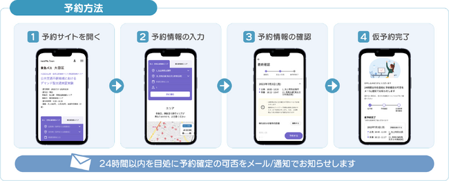 このデマンド型交通実証実験をウェブで予約するには、二次元コードを読み取るか、ニアミーのアプリページにアクセスしユーザー登録行います。(URL:https://app.nearme.jp/town-shuttle/poc-otacity/)その後、予約サイトから乗車地、降車地、乗車人数など必要情報を入力すると、登録したメールアドレスに予約情報の確認メールや通知が届き、仮予約完了となります。仮予約は24時間以内を目途に予約確定の可否を再度通知が届き、予約確定となります。当日、乗車時間になりましたら、予約した乗降地よりご乗車いただけます。乗車の際には予約サイトの登録名(ニックネーム)を乗務員にお伝えください。
