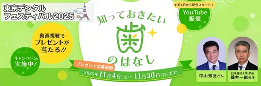 Haleonジャパン株式会社(代表取締役社長:野上 麻理、本社:東京都港区)は、公益社団法人 東京都歯科医師会と共に、今年も東京デンタルフェスティバルを主催いたします。東京デンタルフェスティバルは、2015年より今年で11回目の開催となります。今年は、より多くの方々に楽しみながら口腔ケアの大切さを知っていただき、口腔疾患の予防意識を広めることを目的としています。「いい歯の日」(11月8日)を前に、2025年11月4日(火)から東京都歯科医師会公式YouTubeチャンネルにて、「知っておきたい歯の話」をテーマにした動画を1年間配信します。中山秀征さんがご出演する動画も含め、どなたでもご覧いただけます。また、動画をご視聴いただいた方を対象に、期間限定でプレゼントが当たるキャンペーンも実施します。