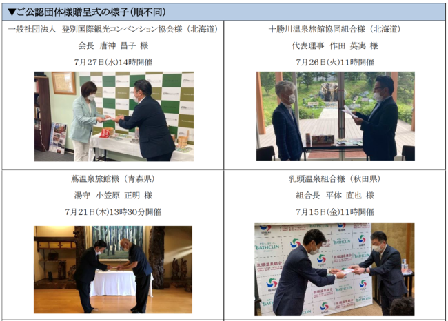 このたび、2022年1月~6月の売上げの一部8,447,011円を第2回目の寄付として、2022年7月15日(金)から7月29日(金)に、温泉タイプ入浴剤「日本の名湯」を公認いただいている全国17か所の温泉地へ寄付金目録を贈呈いたしました。前回の寄付金額7,870,269円と合わせて合計寄付金額は16,317,280円になります。