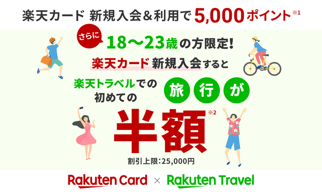 ※2 「楽天トラベル」半額クーポン進呈には、「楽天カード」お申し込み時点での年齢が18~23歳であることと、期間内に楽天カード新規入会が必要です。1回の予約で割引される金額の上限は25,000円となります。