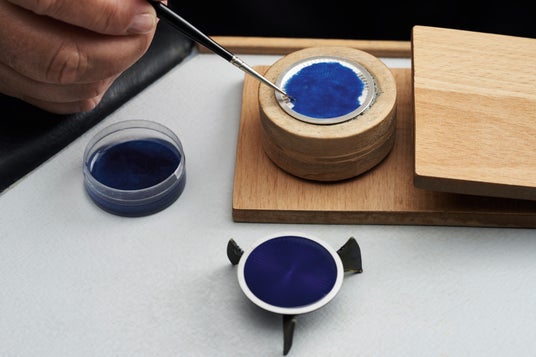 主役は、自社工房で入念に仕上げられたグラン・フー エナメルの文字盤です。文字盤のベースとなるのはサンレイ モチーフ ギョーシェ仕上げを施したシルバーのディスクです。そして、シリカ、鉛丹、カリ、炭酸ソーダを混合してパウダー状にし、金属酸化物と結合して目指すインディゴブルーを作り出すことから魔法が始まります。この粉末を真鍮製のディスクに吹き付けてから約 800°C で焼成します。職人が文字盤を炉から取り出すタイミングを見極め、外観を損ねないよう細心の注意を払って冷却します。ジラール・ペルゴが目指す美しい光沢が得られるまで、この工程を 5-10 回繰り返します。このように忍耐と高度な技術の賜物である文字盤であっても、小さな亀裂や気泡、その他の不具合が生じることがあり、そうなれば完成品としては認められず、最初からやり直しとなります。製造にかなりの時間がかかるグラン・フー エナメルの文字盤は、文字通り、決して色褪せぬ魅力を約束します。