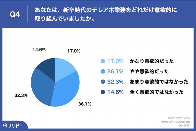 「Q4.あなたは、新卒時代のテレアポ業務をどれだけ意欲的に取り組んでいましたか。」(n=316)と質問したところ、「かなり意欲的だった」が17.0%、「やや意欲的だった」が36.1%という回答となりました