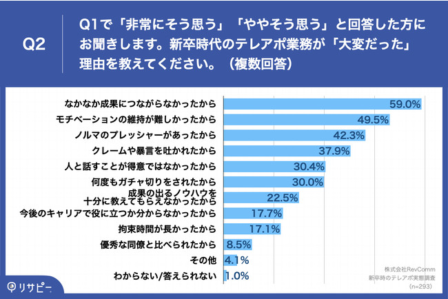 Q1で「非常にそう思う」「ややそう思う」と回答した方に、「Q2.新卒時代のテレアポ業務が「大変だった」理由を教えてください。(複数回答)」(n=293)と質問したところ、「なかなか成果につながらなかったから」が59.0%、「モチベーションの維持が難しかったから」が49.5%、「ノルマのプレッシャーがあったから」が42.3%という回答となりました。