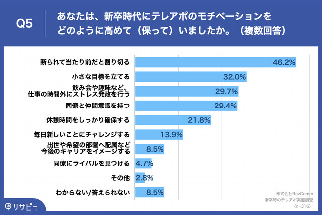 「Q5.あなたは、新卒時代にテレアポのモチベーションをどのように高めて(保って)いましたか。(複数回答)」(n=316)と質問したところ、「断られて当たり前だと割り切る」が46.2%、「小さな目標を立てる」が32.0%、「飲み会や趣味など、仕事の時間外にストレス発散を行う」が29.7%という回答となりました。
