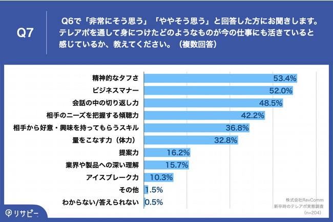 Q6で「非常にそう思う」「ややそう思う」と回答した方に、「Q7.テレアポを通して身につけたどのようなものが今の仕事にも活きていると感じているか、教えてください。(複数回答)」(n=204)と質問したところ、「精神的なタフさ」が53.4%、「ビジネスマナー」が52.0%、「会話の中の切り返し力」が48.5%という回答となりました。