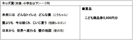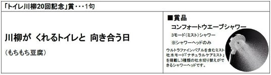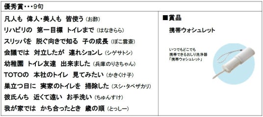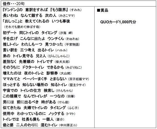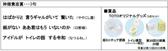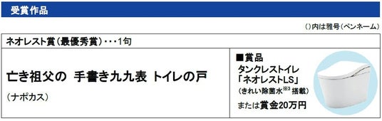 TOTO株式会社(本社:福岡県北九州市、社長:清田 徳明)は、第20回「トイレ川柳」の入賞作品[ネオレスト賞(最優秀賞)(1句)/「トイレ川柳20回記念」賞(1句)/仲畑貴志賞(3句)/優秀賞(9句)/中学生・高校生賞(3句)/キッズ賞(3句)/佳作(20句)]を決定しました。