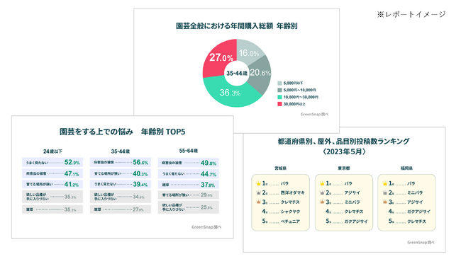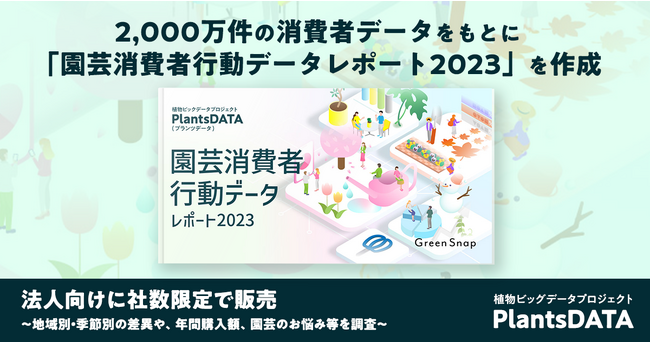 植物コミュニティアプリ「GreenSnap」を運営するGreenSnap株式会社(本社:東京都中央区、代表取締役:西田貴一)は、GreenSnapに投稿された2,000万件の投稿データや、GreenSnapユーザーを対象とした約5,000名のアンケート調査の結果をもとに作成した「園芸消費者行動データレポート2023」を、法人向けに社数限定で販売することをお知らせいたします。かねてから消費者行動がつかみにくいとされてきた園芸業界において、地域別や季節別の人気品種や、年齢別の年間購入額や消費者のお悩み等の実態がわかる貴重なデータです。
