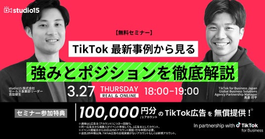 TikTokを中心としたショートムービー(短尺動画)領域で広告代理店事業・プロダクション事業を展開するstudio15株式会社(本社:東京都渋谷区、代表取締役:岩佐 琢磨、読み:スタジオフィフティーン、以下「studio15」)は、TikTok for Business Japanと共同で、TikTok広告の強みとポジションを徹底解説する無料セミナーを2025年3月27日(木)に開催いたします。