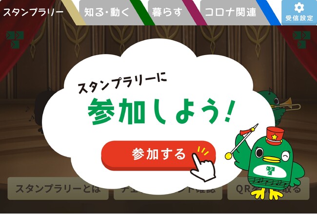 メニュー画面にある、スタンプラリーをタッチ。さらに「参加する」をタッチ。