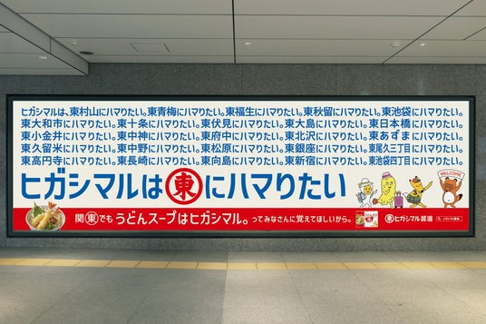 そこで、関東でさらなるファンを獲得するため「ヒガシマルは東にハマりたい」作戦を実施。社名「ヒガシマル」にちなみ東京都内の“東(ひがし)”から始まる全28駅周辺エリアに、その土地ならではのコピーとご当地バージョンに変身したCMキャラクターたちを描いた広告を掲出。