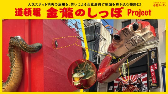 大阪・道頓堀の「金龍ラーメン」の立体看板のしっぽ部分が隣の土地にはみ出ていると訴えられ、撤去することに。単にしっぽを切るのではなく、立体看板設置時は考えもしなかったしっぽ断面のデザイン・龍の立体看板に命を吹き込む涙の装飾・カニの立体看板へのしっぽの設置などのアイディアを、立体看板制作会社や、かに料理店とのコラボレーションによって実現。