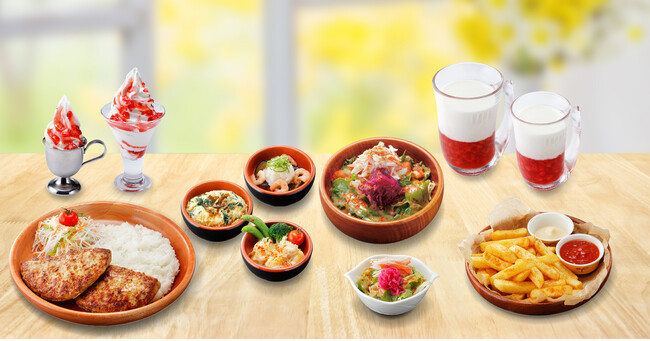 アラカルトメニューでは、やみつきになるスパイシーさが特長の「スパイシーポテト」が新登場。更に、ハンバーグやビールのお供として、ちょい足しできる小さめサイズの小鉢「ふわふわ卵のケランチム」と「エビと揚げナスのおろし和え」、「野菜のマヨチーズ焼き」の3商品が新登場します。