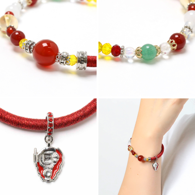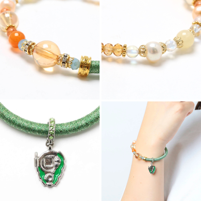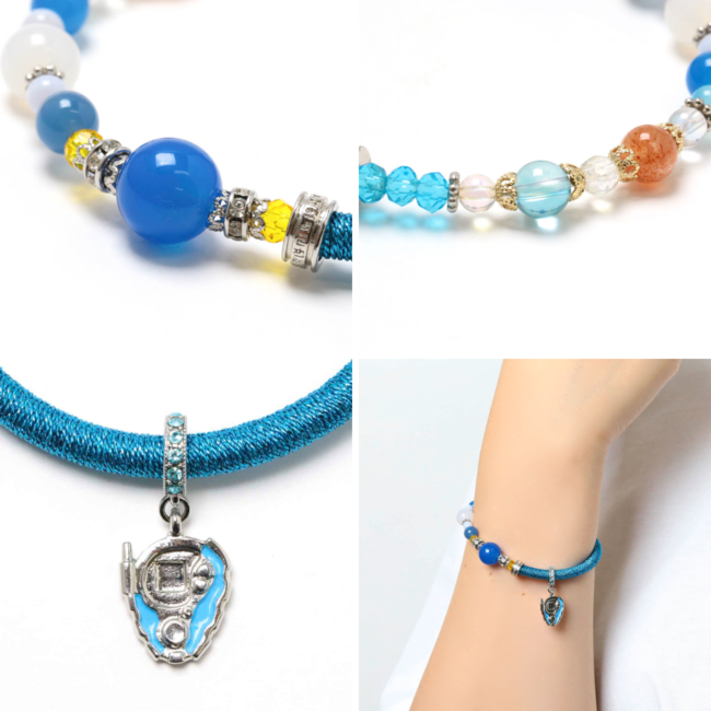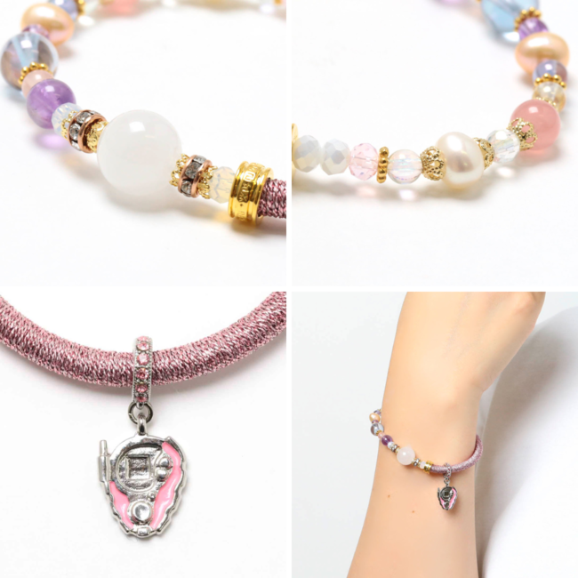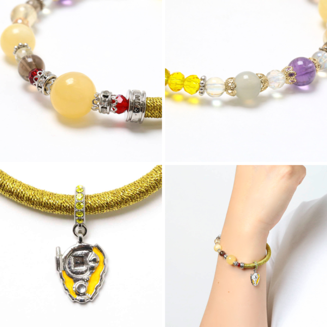 それぞれのキャラクターのイメージカラーやボディカラーの天然石をちりばめたブレスレットには、「D-3」をモチーフにしたメタルチャームが煌めきます。