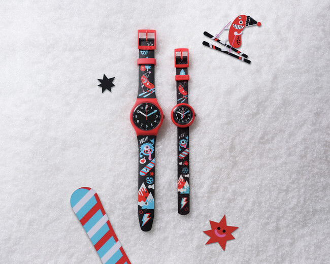 Swatch とFlik Flak では、親子の不思議な絆の素晴らしさをたたえるものを創りたいと考えてきました。子どもと親がお揃いのものを着けるというアイデアです。グザヴィエと、ちょうど時刻の読み方を覚えている最中のマルゴは最高のコラボ相手でした。父娘が自分たちにとって大切なもののアイデアをいろいろ出し合い、大好きなものをすべて詰め込んだ時計を作りました。大好きなものには、アイスクリームやお菓子、ジャンプから山やスキー、スノーボード、そしてモンスターまでいろいろ挙がりました。二人ともアウトドア好きであるとともに地球を大切に考えていて、時計にバイオ由来素材、そしてFlik Flak にはリサイクルPET 製のストラップを使うことに決めました。両方のブランドの陽気でカラフルな雰囲気を取り込んだTIME TOGETHER ウォッチは、キッズと親とのつながりを深め、いつでも笑顔でいられて、一日中、時間通りに過ごせるようになります。