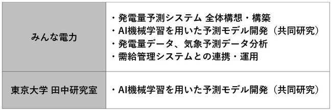 みんな電力は2018年より本システムの構想を開始し、2020年11月より東京大学 田中研究室と予測モデルの共同研究に着手しました。みんな電力にてシステム構築、運用を行い、共同でAIの機械学習を用いた発電量予測モデル開発を行っています。