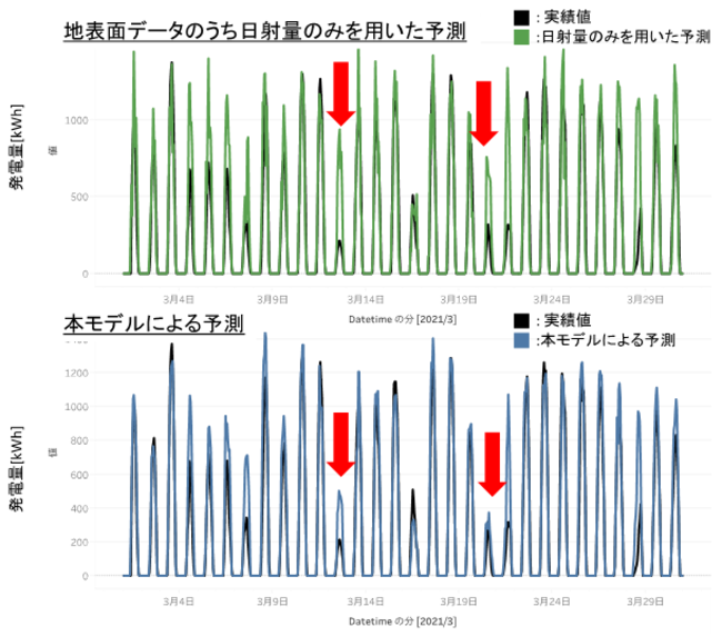 図1はある太陽光発電所における予測の比較であり、上のグラフは比較対象手法として日射量予報値に基づく予測を、下のグラフは本手法による予測を示しています。特に本手法においては、赤の矢印の部分において大きく単に日射量のみを入力する手法よりも精度が向上している様子が見えます。