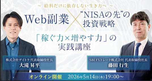 SBI FXトレード株式会社(本社:東京都港区、代表取締役社長:藤田行生)と株式会社デイトラは、これからの時代に求められる「働き方」と「資産形成」の両輪をテーマとしたコラボウェビナー「【給料だけに依存しない生き方へ】Web副業×" NISAの先" の投資戦略「稼ぐ力×増やす力」の実践講座」を2026年5月14日(木)19:00~にオンライン開催いたします。