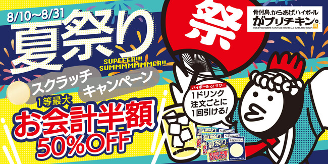 株式会社ブルームダイニングサービス(所在地:名古屋市中村区、代表取締役:杉村明紀)が運営する飲食ブランド「がブリチキン。」は、8月10日~31日の期間「夏祭りスクラッチキャンペーン」を開催いたします。単品ハイボール・サワーを1杯ご注文ごとに1枚スクラッチを引いていただき、最大で“お会計から50%オフ”が当たるなど、豪華特典をご用意!また次回来店時にご使用いただける「ドリンク半額券」などハズレ無しの内容となっております。