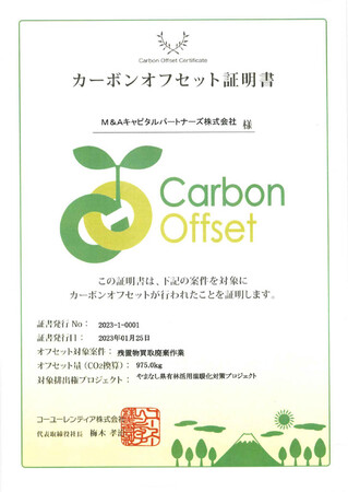 旧オフィスから今回の新オフィスへの移転には、CO2排出量の削減を目的とした「カーボンオフセット」をおこない、975.0kgのCO2削減に成功いたしました。