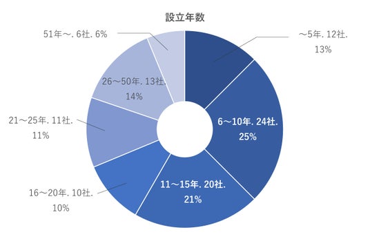 設立から10年未満は36社(37.5%)、20年未満は66社(68.8%)となっています。