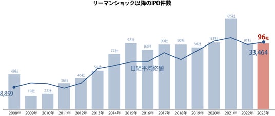 2023年の国内IPO企業数は96社で、近年の水準を維持した着地となりました。
