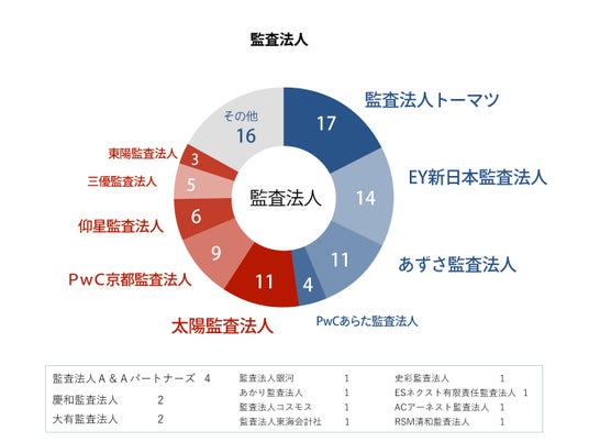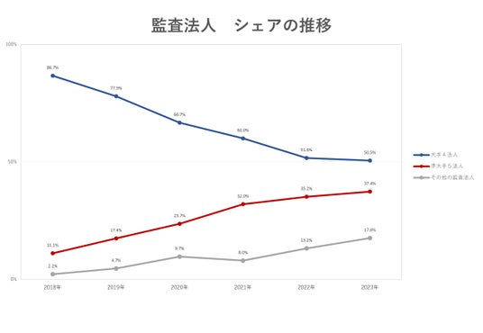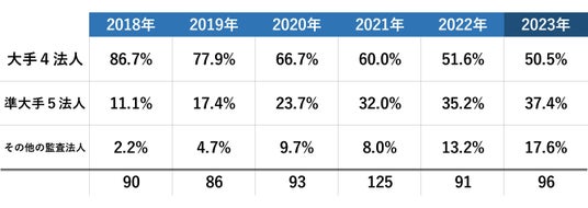 大手4社(トーマツ、EY新日本、あずさ、PwCあらた)のシェアは50.5%、準大手5社(太陽、PwC京都、仰星、三優、東陽)のシェアは37.4%、大手・準大手合わせたシェアは83.3%となりました。
