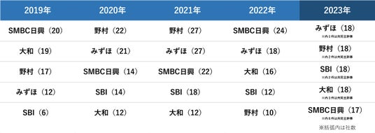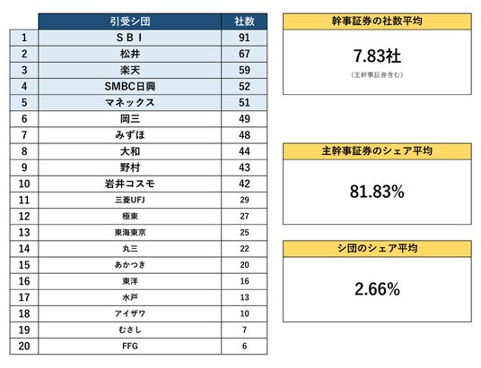 また、引受シ団のランキングでは前年に続きSBI証券が89社でトップとなりました。SBI証券は主幹事証券も合わせて91社(94.8%)のIPOに幹事証券として参入していることになります。