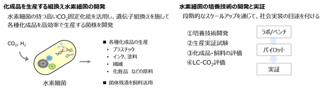 本事業では、水素細菌を使ったバイオプラスチックの原料となるバイオ化学品の生産菌体の開発、水素細菌の培養設備の実証規模へのスケールアップ、実証試験のオペレーションを担当します。