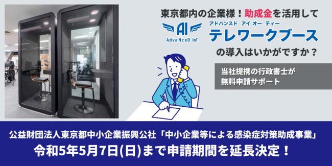 この度、当社は東京都中小企業振興公社が実施する「感染症対策サポート助成事業」の助成金申請において、当初の3月31日の締め切りに向けて、多数のご相談をいただきました。結果、多くの企業様の採択をサポートさせていただき、AdvaNceD IoTテレワークブースを導入いただくことができました。