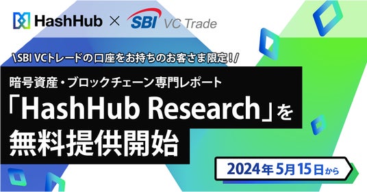 SBI VCトレード株式会社(本社:東京都港区、代表取締役社長:近藤 智彦、以下「当社」)は、2024年5月15日(水)より、同じくSBIグループで暗号資産・WEB3の専門リサーチ・コンサルティングサービスを提供する株式会社HashHub(本社:東京都港区、代表取締役:平野淳也、以下「HashHub」)と連携し、SBI VCトレードで口座をお持ちのお客さまに「HashHub Research」を無料で提供するサービス開始しますので、お知らせいたします。
