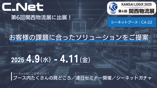 クラウド型倉庫管理システムの開発・提供を手掛ける株式会社シーネット(以下シーネット、本社:千葉県千葉市、代表取締役CEO:小野崎伸彦)は、2025年4月9日(水)から11日(金)にインテックス大阪で開催される「第6回関西物流展」に出展することをお知らせいたします。