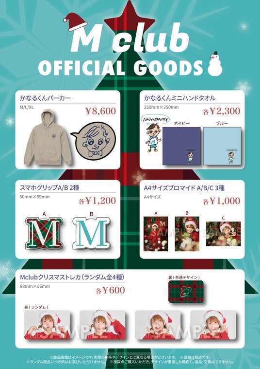 今回販売されるのは、サンタ衣装のビジュアルを使用した今だけのアイテムや、今回のグッズのために改めて描き下ろしたMclub準公式(!?)キャラクター『かなるくん』をモチーフに、モモコグミカンパニーらしい個性が光るキュートなアイテムたち。