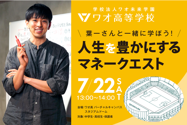 ワオ高校が推進する “グローバルな教養探究”をテーマにしたオープンスクール「 夏の学び博覧会」の第二弾として、人気YouTuber 葉一さんと一緒に学ぶシリーズ、中学生からの「人生を豊かにするマネークエスト」を7月22日(土)に開催することをお知らせします。