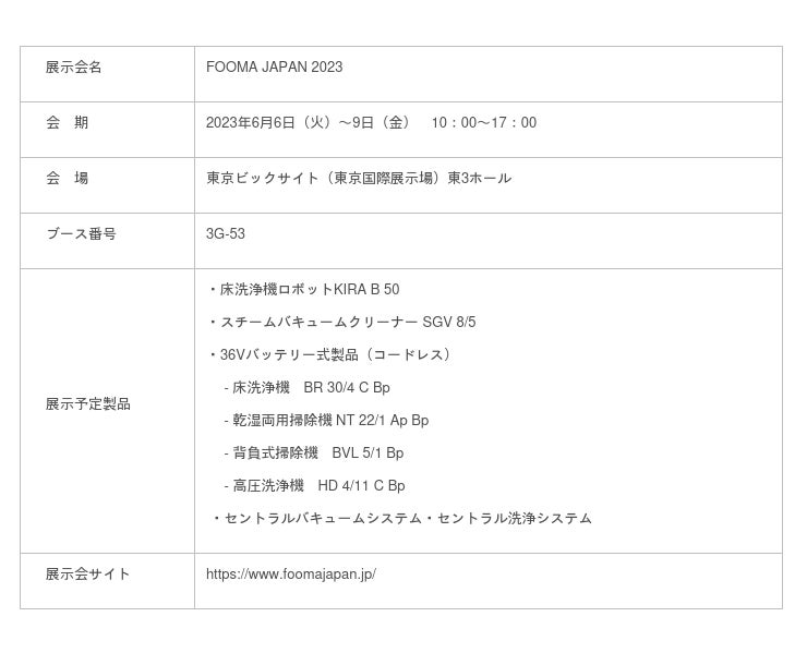 清掃機器の最大手メーカー、ドイツ・ケルヒャー社の日本法人、ケルヒャー ジャパン株式会社(本社:神奈川県横浜市港北区、代表取締役社長:マーク・ヴァン・インゲルゲム)は6月6日(火)~9日(金)に東京ビッグサイトにて開催される世界最大級の食品製造総合展「FOOMA JAPAN 2023」に出展します。