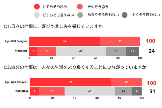 ・はたらくWell-being指標(Q1~Q3)において、TOP2項目の合算値を見ると、Age-Well Designerのスコアはすべての設問で外部比較値を大幅に上回る結果。
