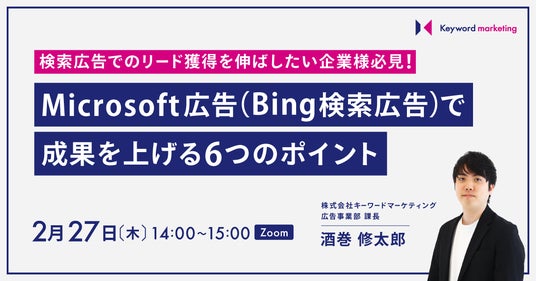株式会社ベクトル(本社:東京都港区、代表取締役会長兼社長:西江 肇司、東証プライム:6058)の子会社である株式会社キーワードマーケティング(本社:東京都港区、代表取締役会長:滝井 秀典)は、無料オンラインセミナー『検索広告でのリード獲得を伸ばしたい企業様必見!Microsoft広告(Bing検索広告)で成果を上げる6つのポイント』を2月27日(木)14時より開催いたします。
