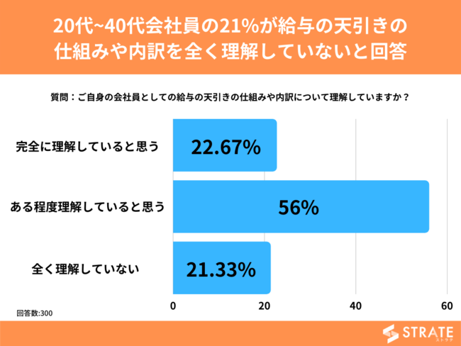 20代~40代の男女を対象とした「ご自身の会社員としての給与の天引きの仕組みや内訳について理解していますか?」というアンケートで最も多かった回答は「ある程度理解していると思う」で56%でした。