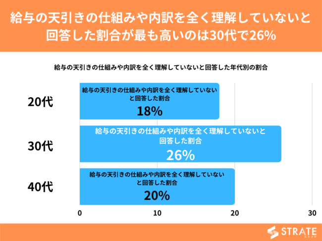 給与の天引きの仕組みや内訳を全く理解していないと回答した割合を年代別でみてみますと、30代が最も多く26%、次いで40代の20%、20代は18%という結果になりました。