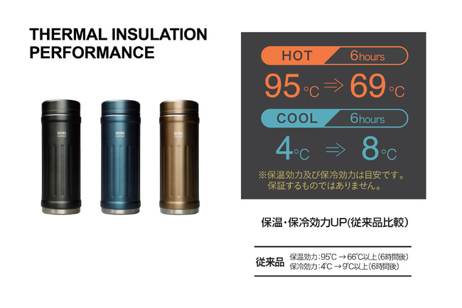 従来品と比べ、保温力、保冷力ともにUP。美味しいコーヒーをより長く楽しめます。