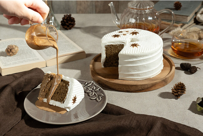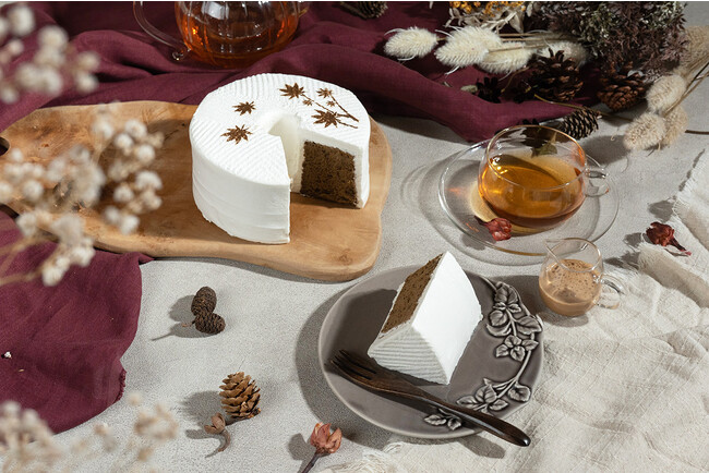 九州産生クリームと国産マスカルポーネを使用したコクのあるクリームでシフォンを包み込み、天面には紅茶パウダーで秋の訪れをイメージしたデザインを施しました。