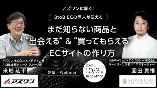 AI技術をベースとしたデジタルマーケティングサービスを提供するシルバーエッグ・テクノロジー株式会社(本社:大阪府吹田市、代表取締役社長&CEO:トーマス・フォーリー、証券コード 3961、以下 シルバーエッグ)は、2024年10月3日(木)にBtoBおよびBtoC事業者のEC担当者を対象としたウェビナー「アズワンに訊く! BtoB ECの巨人が伝えるまだ知らない商品と“出会える”&“買ってもらえる”ECサイトの作り方」を開催いたします。