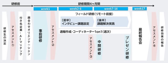 地域越境ビジネス実践プログラムは4ヶ月間の研修プログラムとなります。受講生は10時間程度の座学(実践型スキル習得研修)を受講後、リモート環境下でダブルワーク型フィールド研修(月間30時間×4か月)を通じて、企業課題や地域課題の解決に取り組みます。その際に、次世代リーダーに必須のスキルである生成AIなどのデジタルスキルを駆使して、地域企業におけるビジネスへ実装を行います。