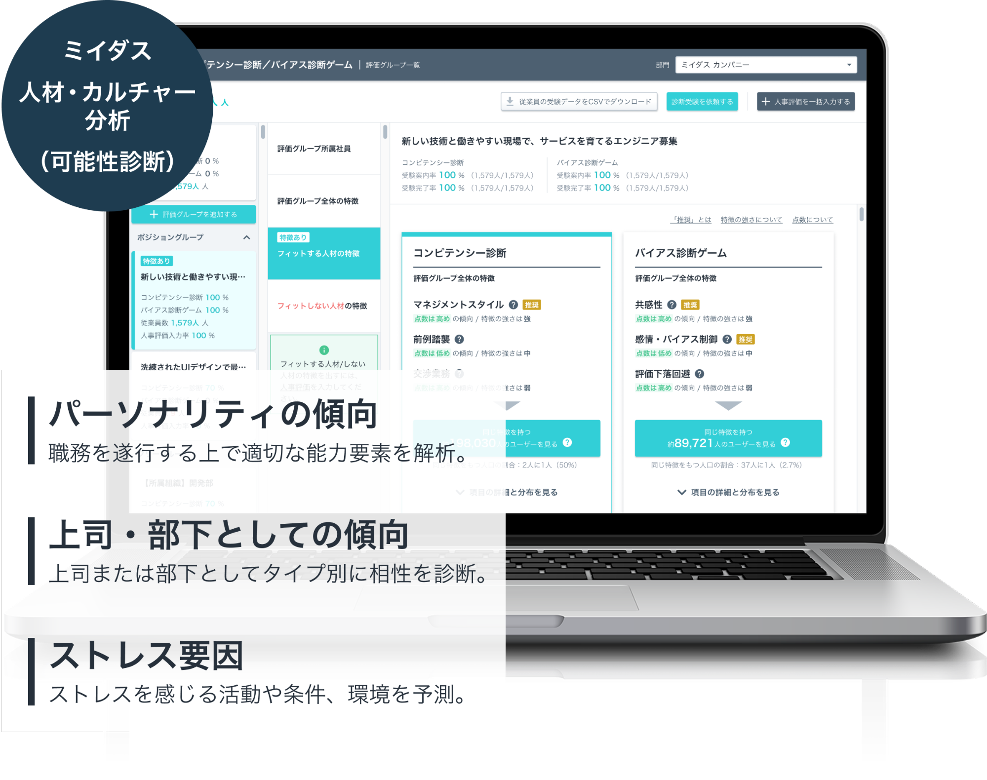 求職者は『ミイダス』独自の「可能性診断」で求職者のビジネスシーンにおける行動・思考の特徴やストレス要因、認知バイアスの強さなどを可視化し、ビジネスパーソンとしての自身の特徴や強みを知ることができます。