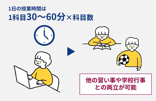 オンライン留学は、他の習い事や学校行事との両立が可能です。1日の授業時間は1科目30分~60分×科目数で、日本にいながら受講できるため、忙しいスケジュールの中でも参加がしやすくなっています。