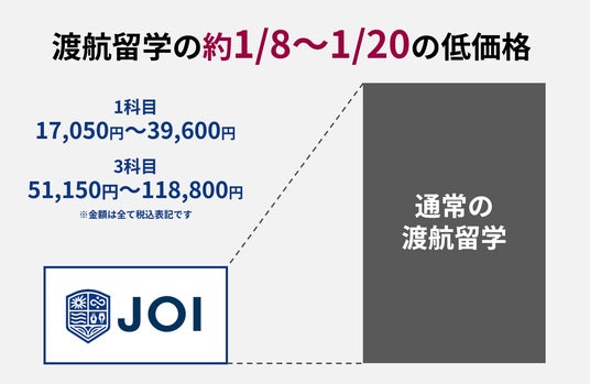 通常の渡航留学に比べ、JOIのオンライン留学は約1/8~1/20の低価格で提供されます。10日間のプログラムで1科目17,050円~39,600円(税込)、3科目受講で51,150円~118,800円(税込)と非常にリーズナブルな価格で留学経験をすることができます。