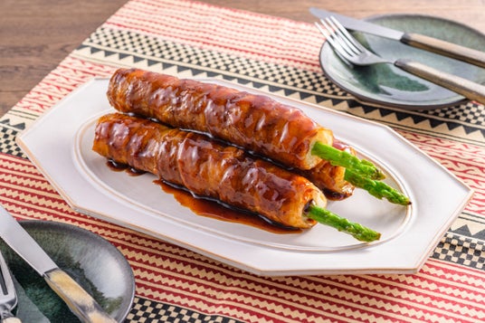 超大型モンスターを迎撃する巨大な槍「撃龍槍」に見立てたアスパラガスをさしたちくわに、さらに豚バラ肉で巻いて、「キッコーマン クセになる 豚脂にんにく醤油だれ」で焼き絡めて表現。たれがよく絡んだ、重量感のある1品です!