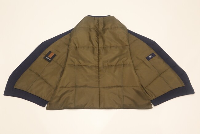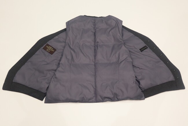 今回は、スーツに合わせやすいジレを提案するために、中わたのボリューム感の調整に注力しました。保温性をしっかり感じる分量にしながらも、膨らみを抑えるために内側にはステッチキルトを採用。また表側は、ステッチを入れずにキレイ目な見た目にするなど、スーツの下に合わせやすいテーラード調のデザインに仕上げました。